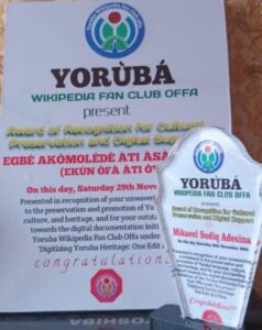 The climax of the event featured the presentation of awards to Ègbé Akọmolèdè Yoruba ẹkùn Ọfà and Oyun and the Global President of Yoruba Wikimedians User Group